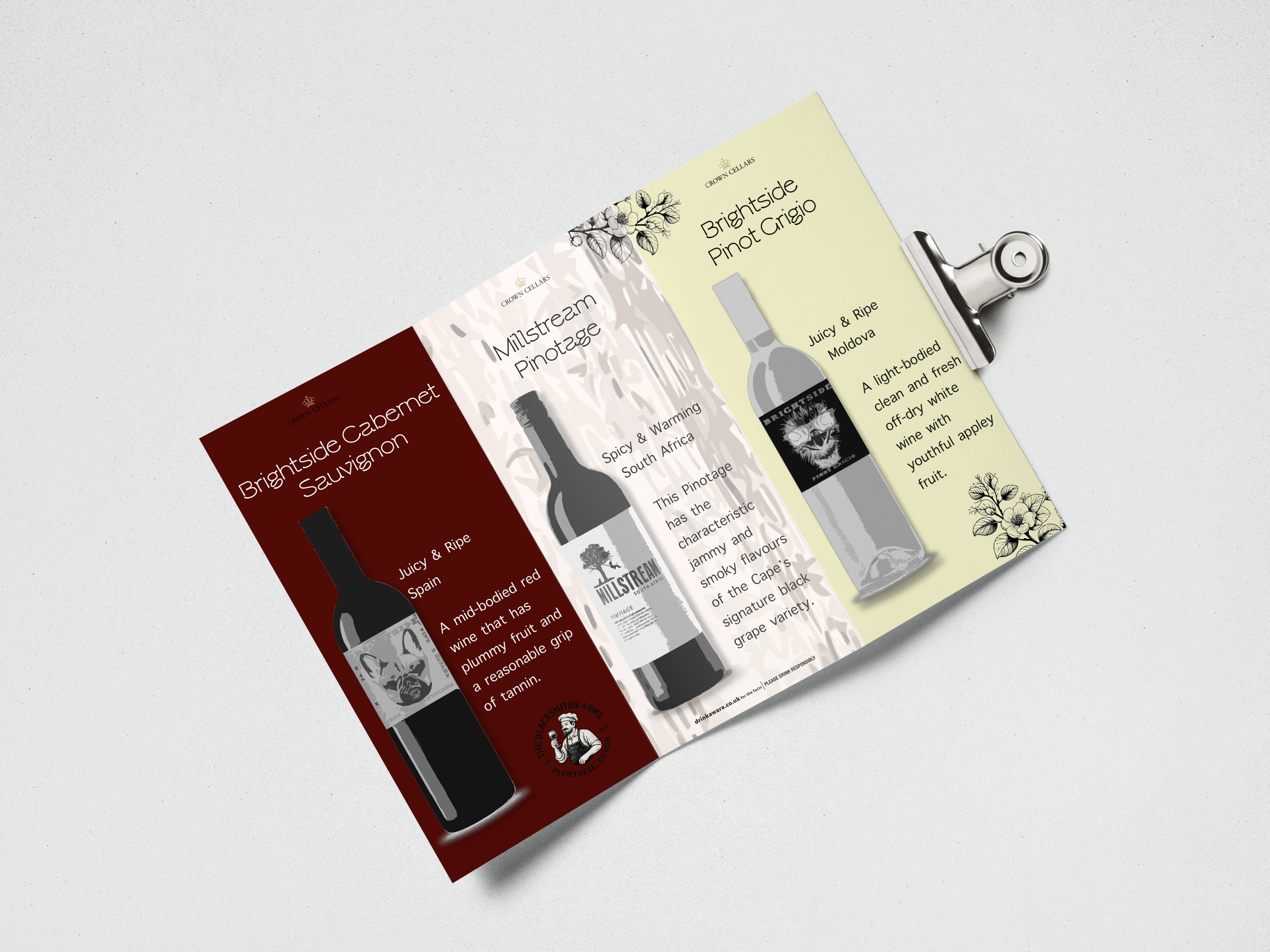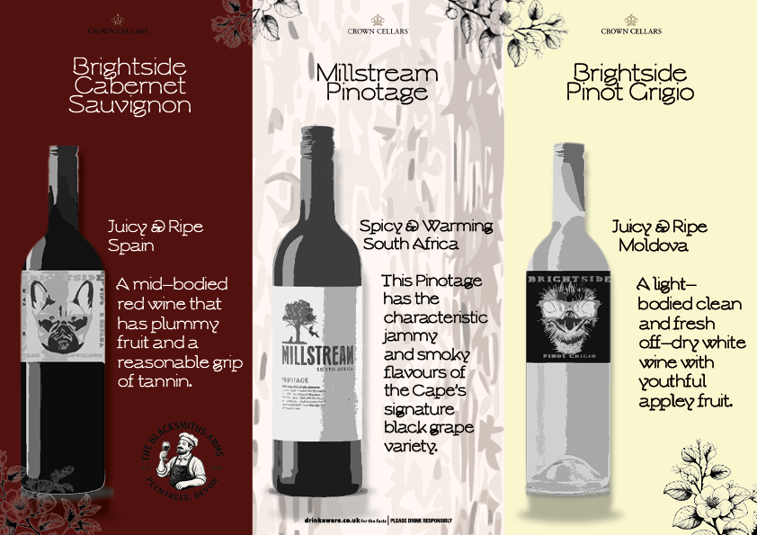 Tabletaker advertising Crown Cellars wine selection for The Blacksmith Arms, Devon.
